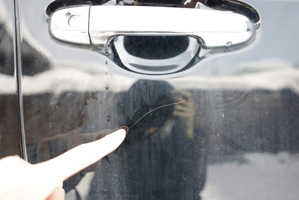 爪が少し引っかかる程度のキズは、クリア層を超えて塗装面(ベースカラー)に達しています。この場合は研磨だけでは消えないため、補修剤などを使って色を補ってあげる必要があります。